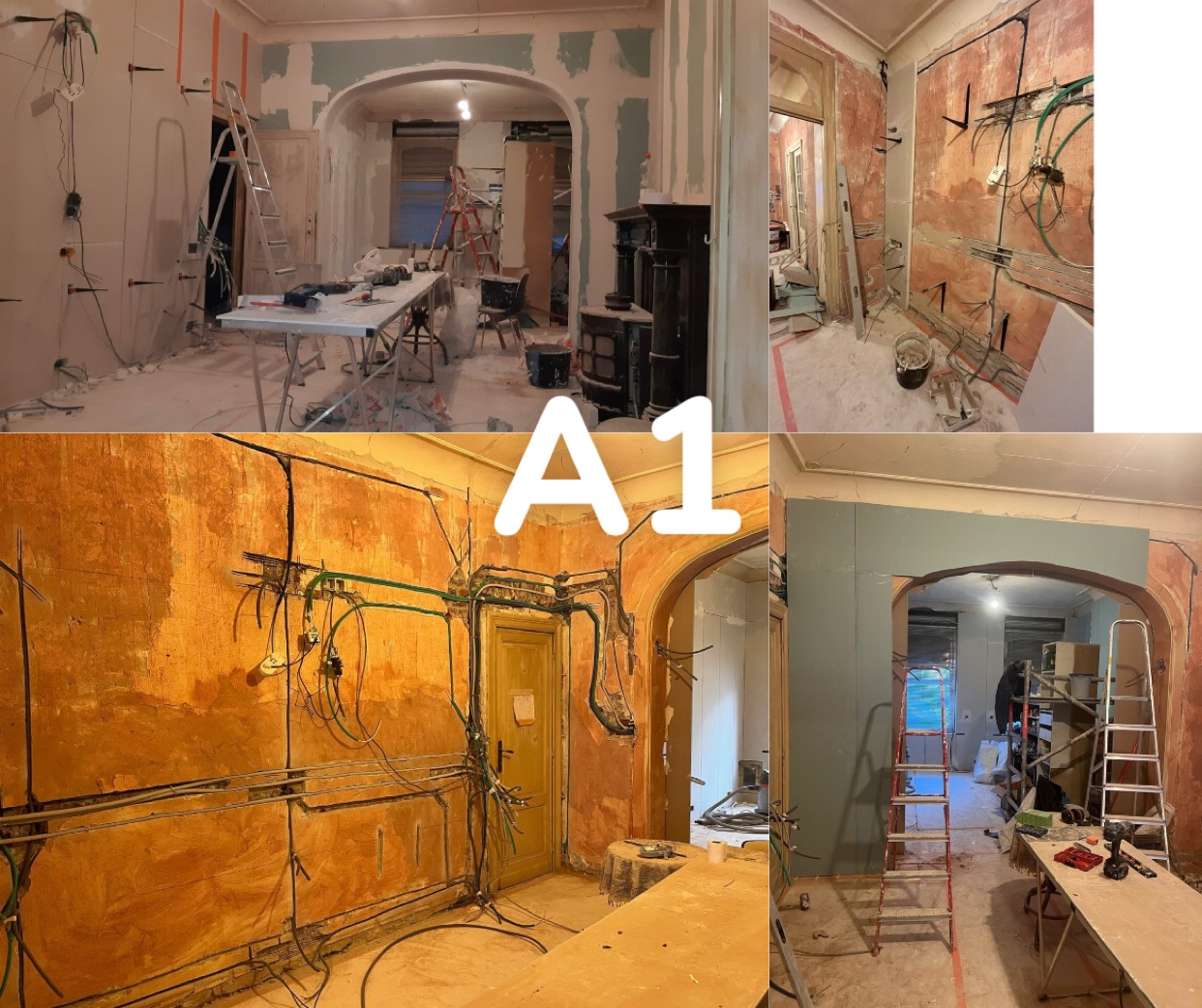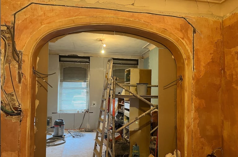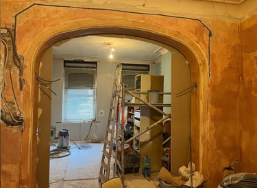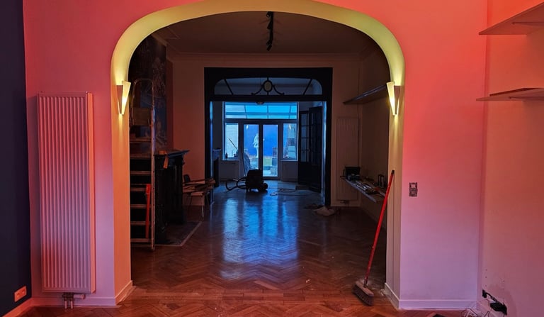 Rénovation d’un 3 pièces en enfilade à Bruxelles, avec mise en valeur des volumes, des arches et de la circulation entre les espaces.